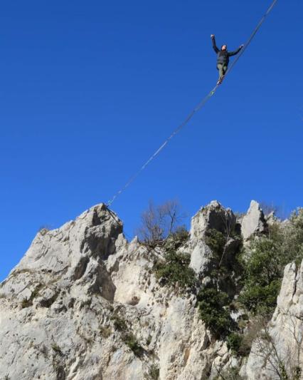 L’highline è la versione più poetica della slackline e consiste nella pratica del funambolismo a grande altezza. Questa è molto impegnativa a livello di performance, di installazione e di materiale. Richiede inoltre, non solo una particolare abilità psico-fisica, ma anche una serie di conoscenze e competenze molto specifiche tratte da altre attività sportive: l’ arrampicata, l’alpinismo, la geologia, la chiodatura in montagna, il treeclimbing, lo yoga e la meditazione. L’ attrezzatura che utilizziamo è molto costosa, in quanto specifica e nel rispetto dei criteri di sicurezza propri degli sport praticati in aria. Ciò comporta il controllo costante di suddetto materiale, nonché suo rinnovo e sostituzione.
